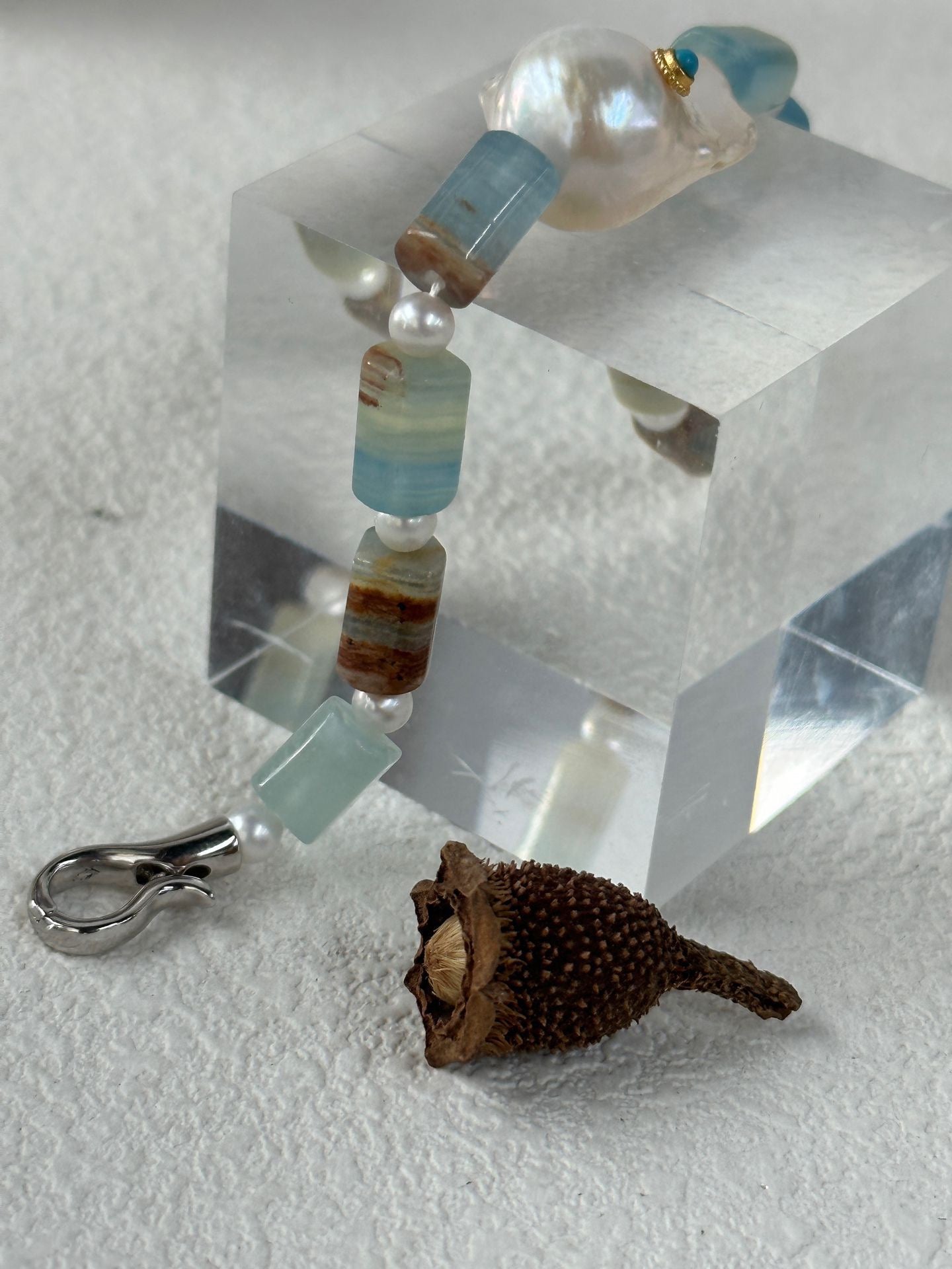 An elegant interplay of cool and warm tones — this bracelet features bold cylindrical stones in predominantly serene blue shades, accented with subtle earthy hints. At its heart rests a large, lustrous baroque pearl, its organic surface set with a delicate turquoise stone, adding a touch of ocean’s depth.
