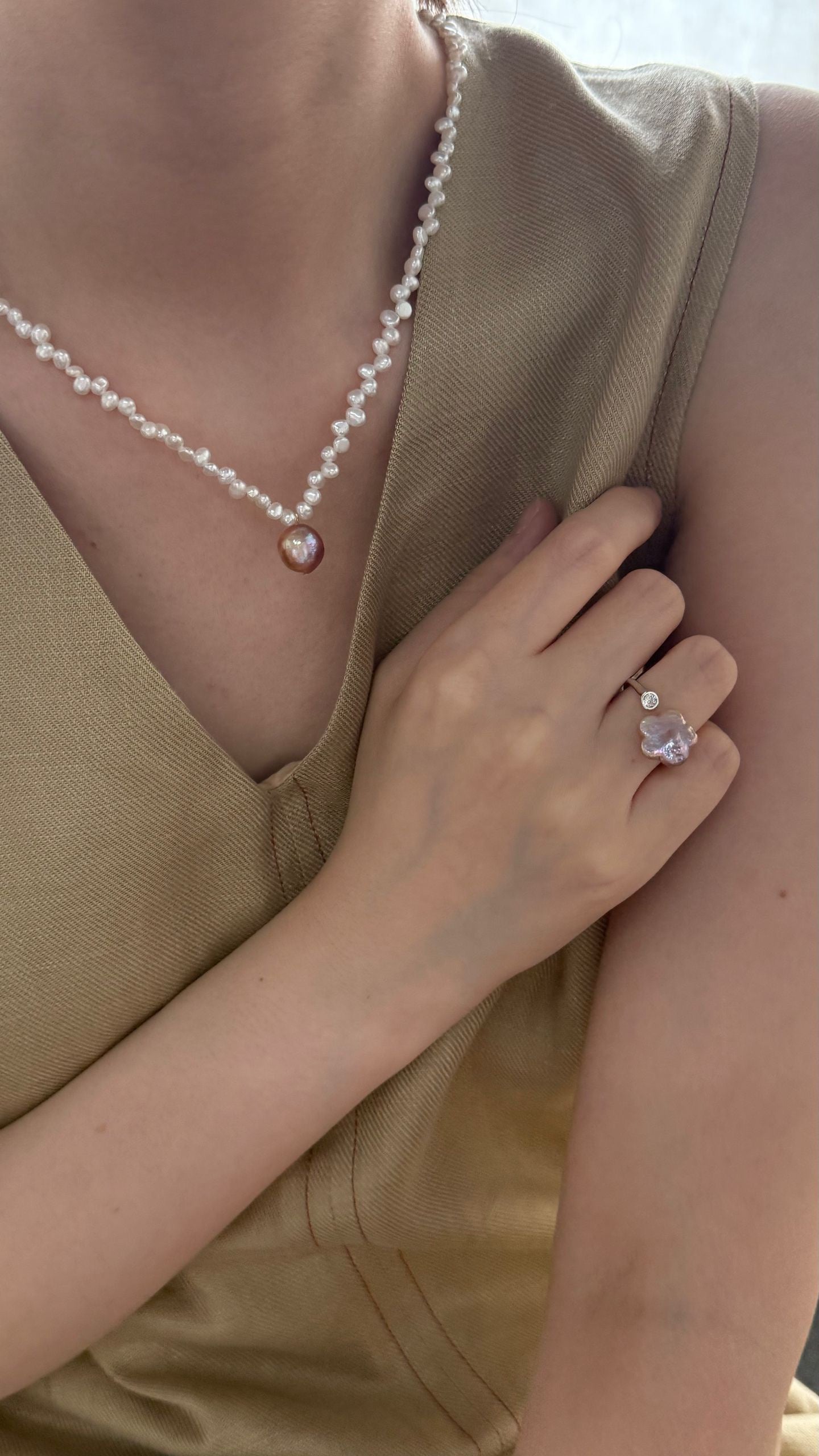 It features one large blush pink baroque pearl alongside a strand of luminous white baroque pearls, each uniquely shaped and softly radiant.