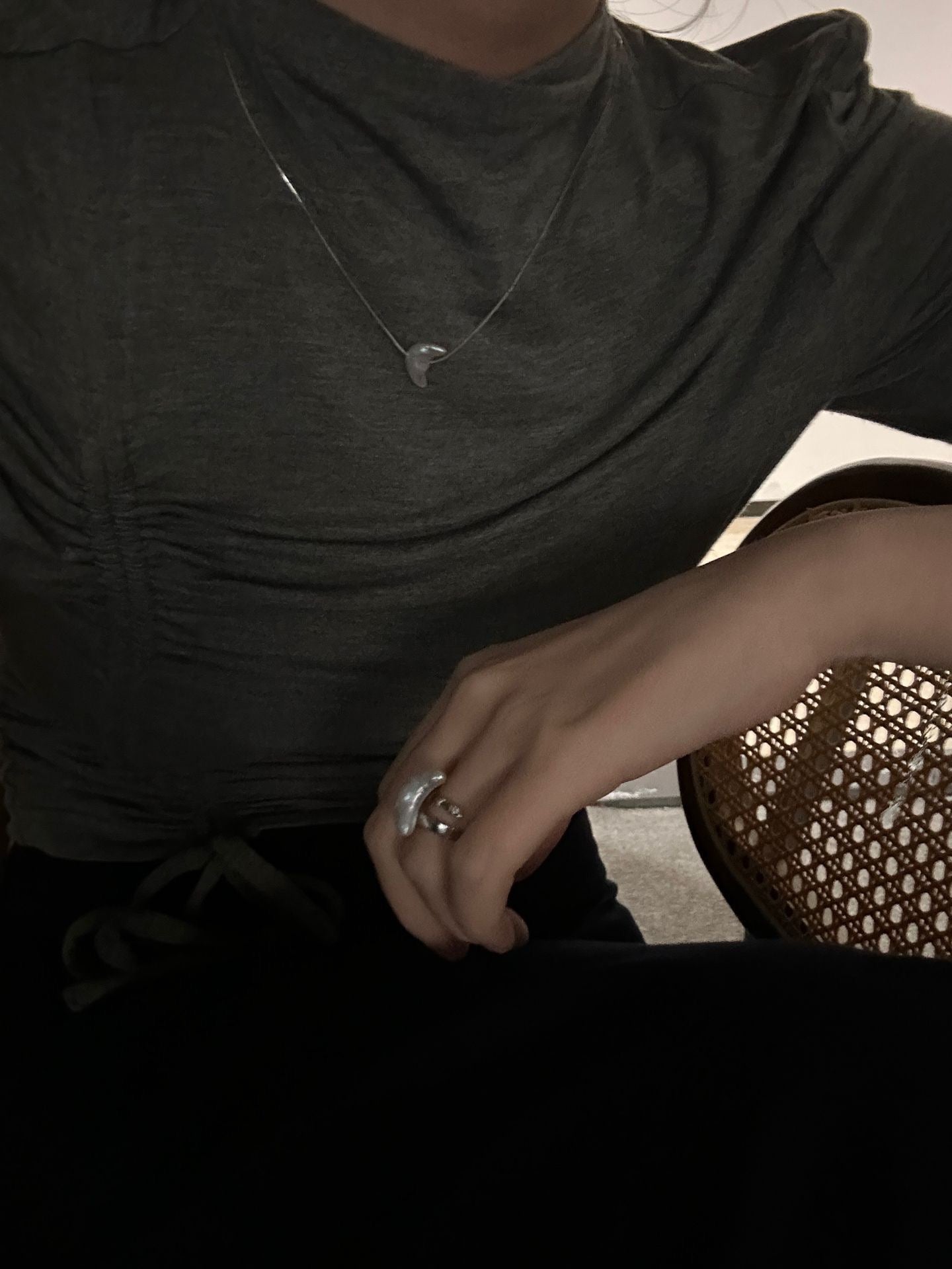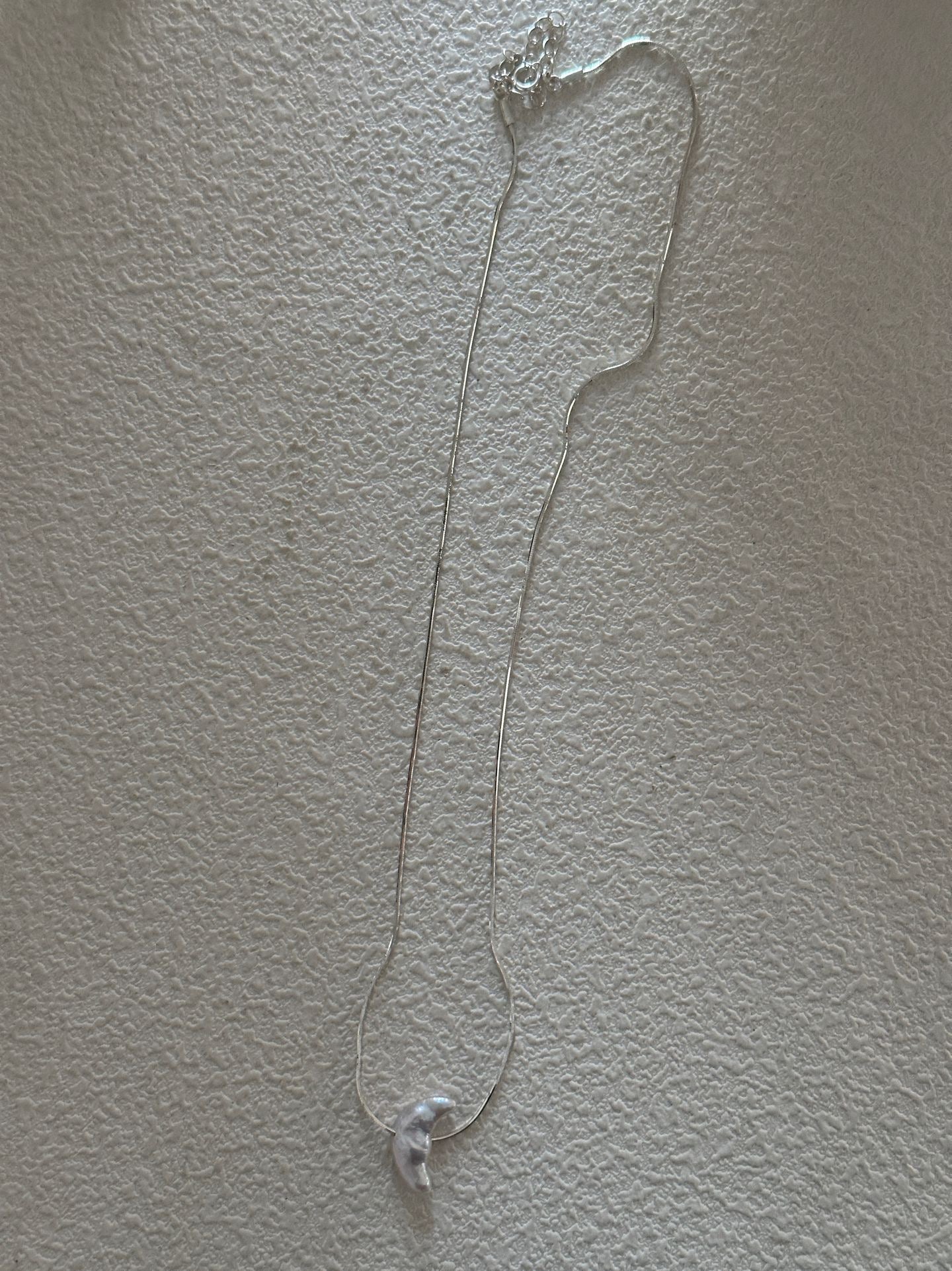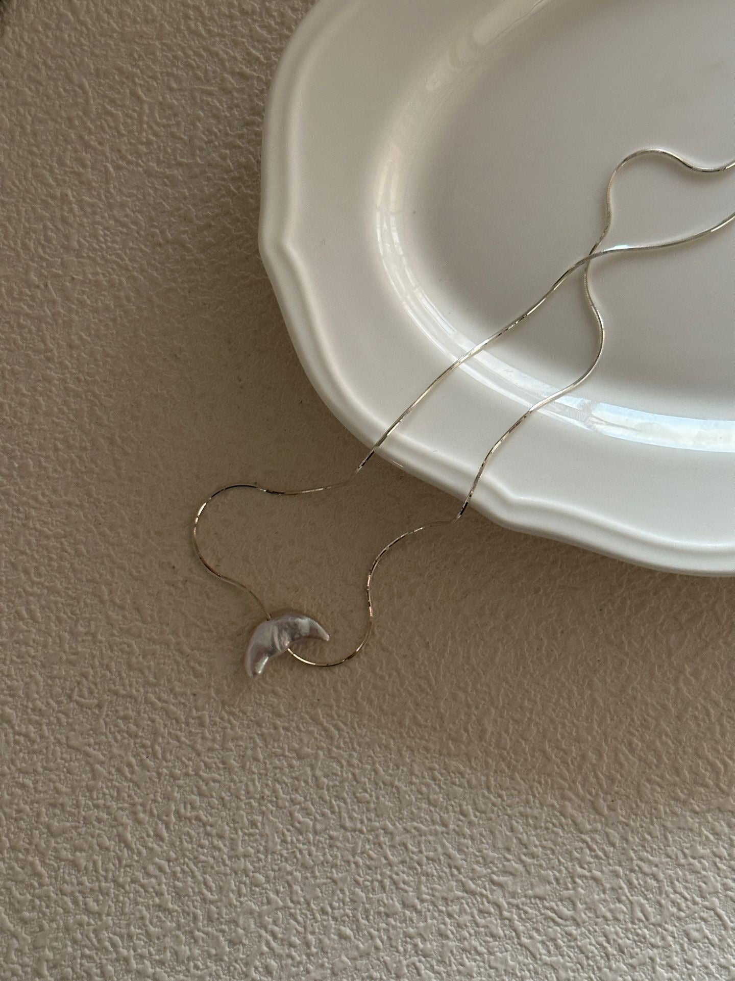 This necklace features a luminous crescent-shaped baroque pearl suspended on a 42cm + 5cm sterling silver snake chain. The high-polish silver chain enhances the pearl’s natural shape and iridescence, creating a modern yet ethereal statement piece.