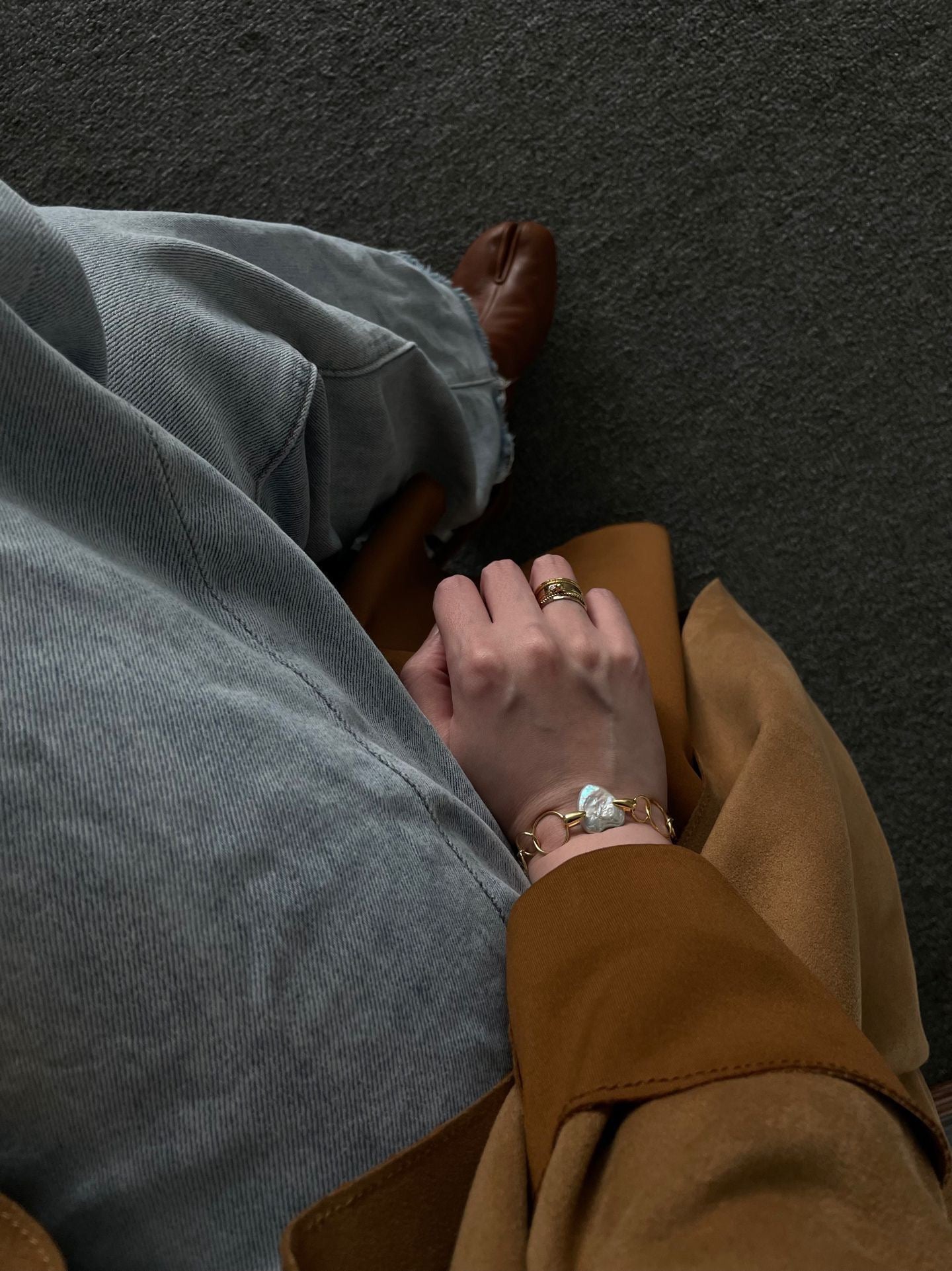 This statement bracelet features a sequence of gold-toned rings in varying sizes, creating a playful yet refined rhythm around the wrist. At its center hangs a baroque freshwater pearl in a natural heart shape — a soft, organic contrast to the clean geometry, adding personality and a touch of romance.