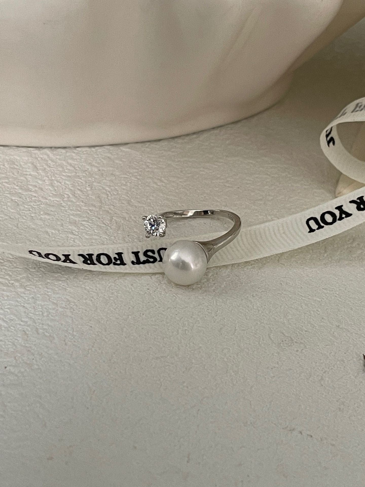 This open sterling silver ring features a polished, mirror-like band with one end adorned by a sparkling cubic zirconia and the other by a smooth, round white freshwater pearl (size 8-9mm). The sleek design balances brilliance with softness for an elegant and modern statement.