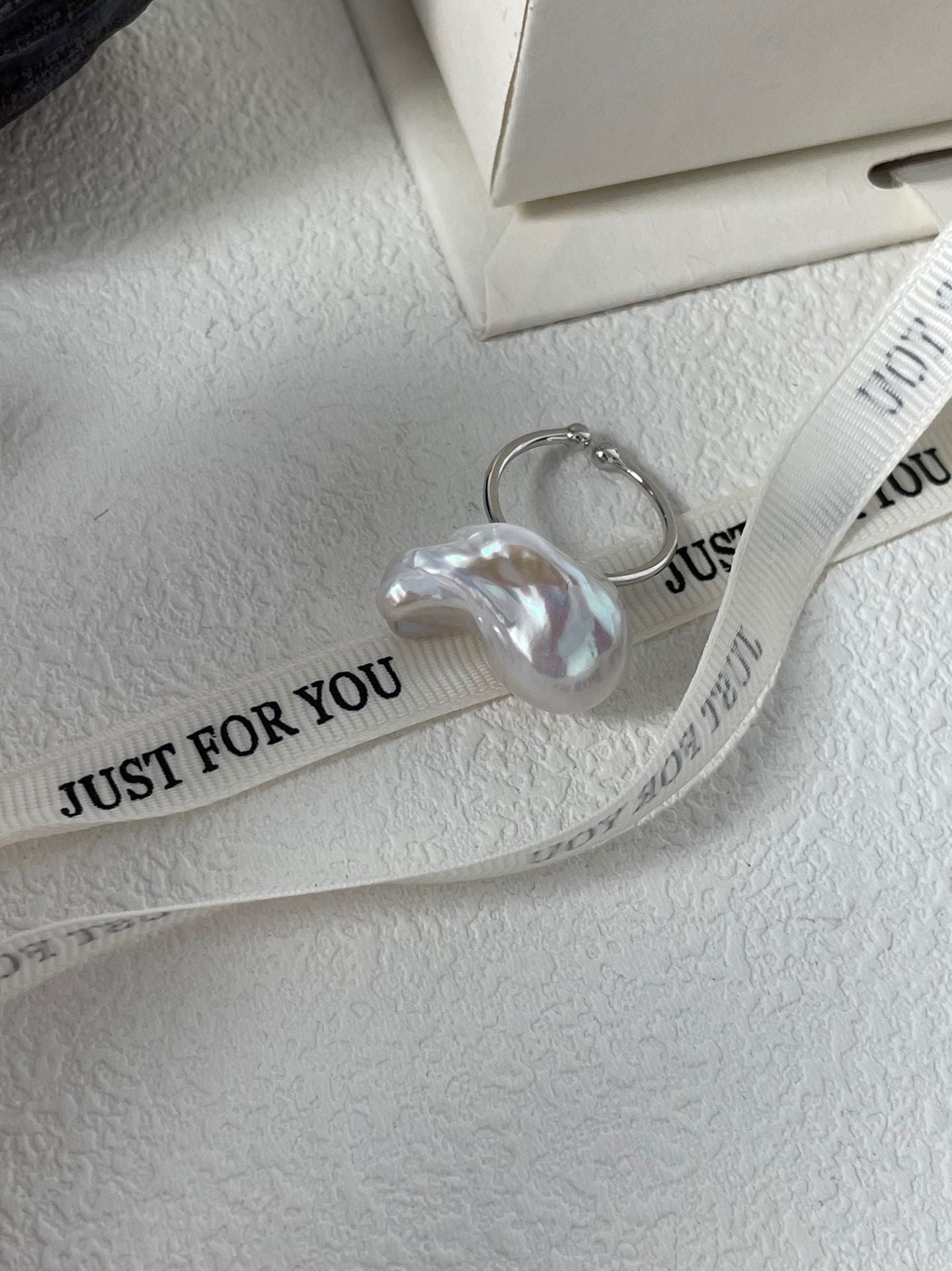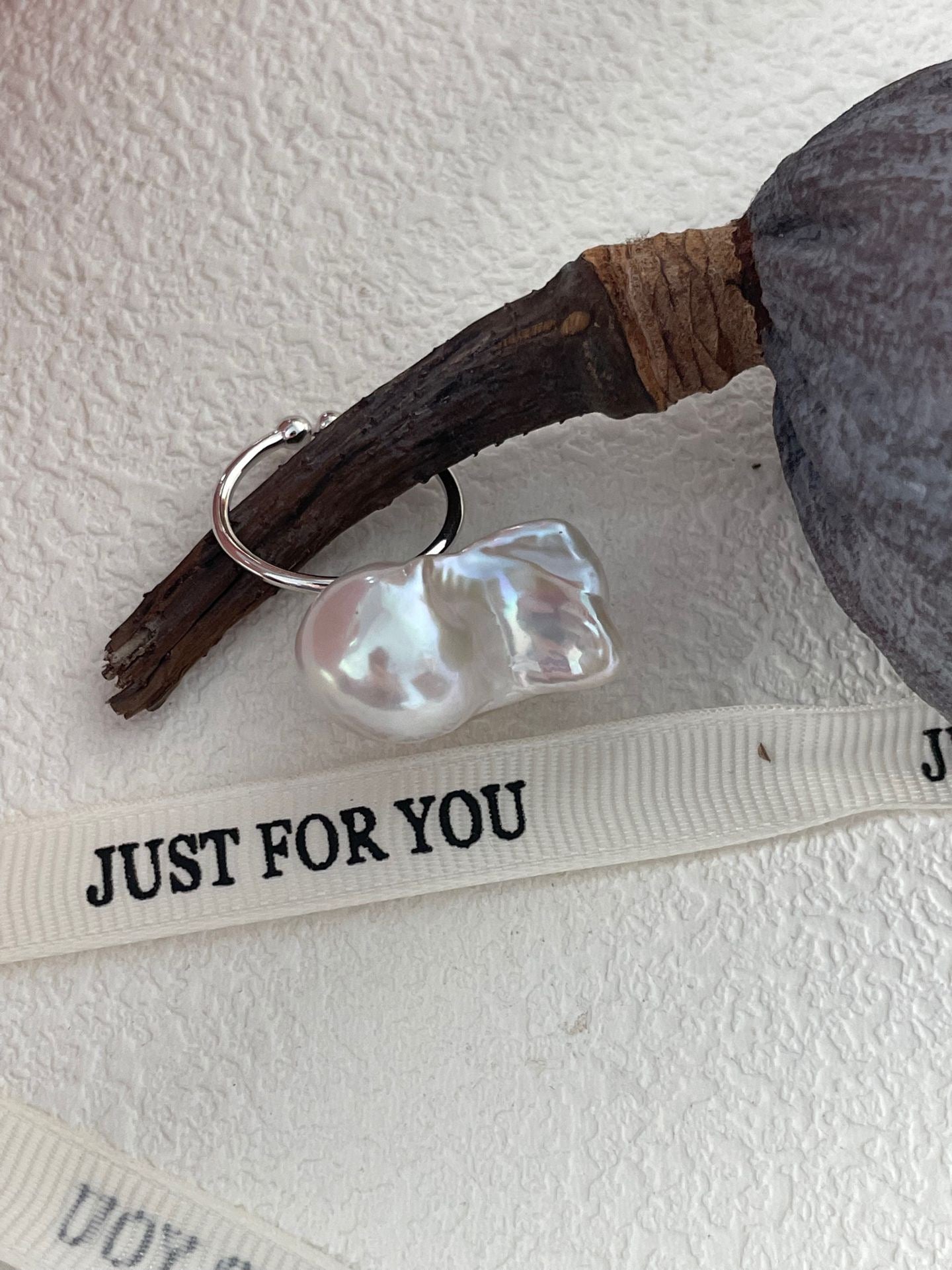 This open sterling silver ring ends with two small polished beads, framing a large, uniquely shaped baroque pearl as its centerpiece. Its organic form and lustrous surface evoke a quiet majesty—pure, elegant, and full of character.