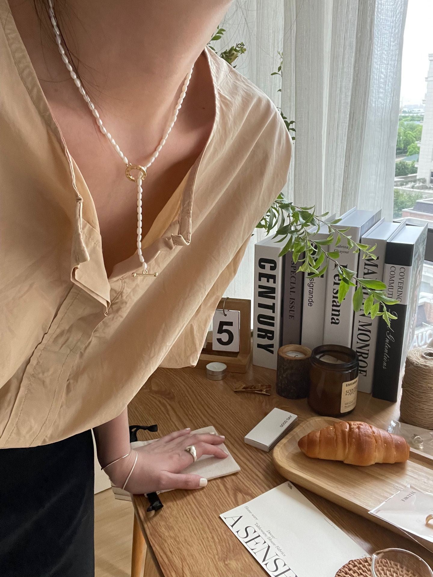 This delicate necklace is crafted with fine, gold-plated micro beads and accented by a Roman numeral-inspired toggle clasp. A single freshwater pearl rests near the clasp — a quiet nod to nature's unique beauty.